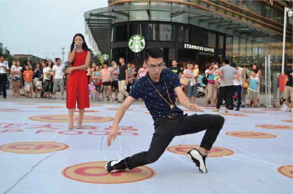 活动时长大约30分钟,首先快闪人员在王府井南昌路店门口广场中央集合,穿戴着简单大方、整齐利索的衣物四处游走在人群中。时间一到,音乐响起,歌手慢慢走近中央,一首振奋人心的“我和你”拉开整个活动的序幕,瞬间引起了在场所有人群的关注。紧接着舞蹈演员闪亮上场,展开了一场激情澎湃的机械舞,带动现场观众情不自禁参与到表演中来,此时人流迅速聚拢,引起围观。然后正大食品有限公司员工身着公司服装,唱着正大集团《爱是正大无私的奉献》一起出现在广场中央,随后几段歌舞串烧将现场气氛推向***,在观众意犹未尽之时迅速闪开在人群之中。活动过程中穿插进行了分发公司宣传材料、食品安全知识宣传单,现场观众品尝了洛阳正大猪肉调理品、酱卤产品及集团现代食品。
