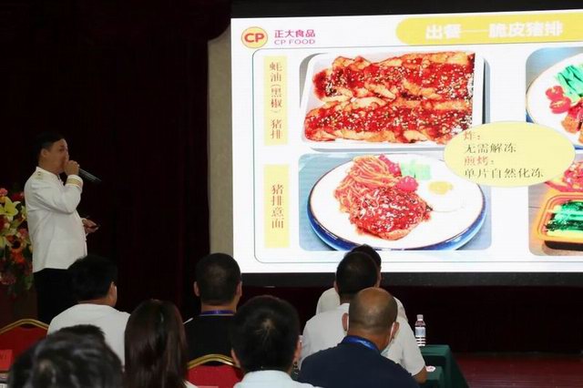 注册中国烹饪大师、洛阳正大食品研发厨务总监张立新先生向团餐大会介绍了洛阳正大食品开发的十余款预制猪肉调理产品,并从后厨实操角度分享了产品特色和卖点,逐一介绍了出餐加工标准和配餐流程。